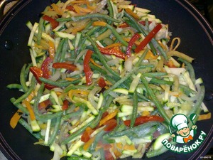 • Добавить сладкий перец соломкой и замороженную спаржевую фасоль