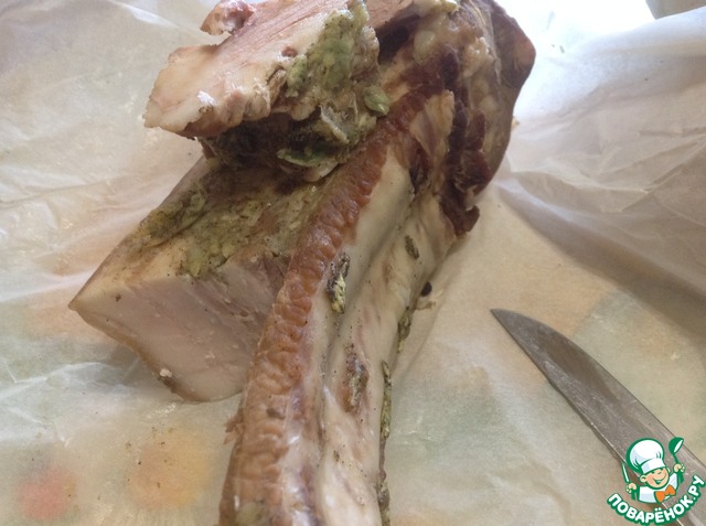 Грудинку мою, делаю проколы ножом и хорошенько нашпиговываю чесноком, предварительно разрезав одну дольку на 3-4 кусочка (ушла целая головка на такой кусок)