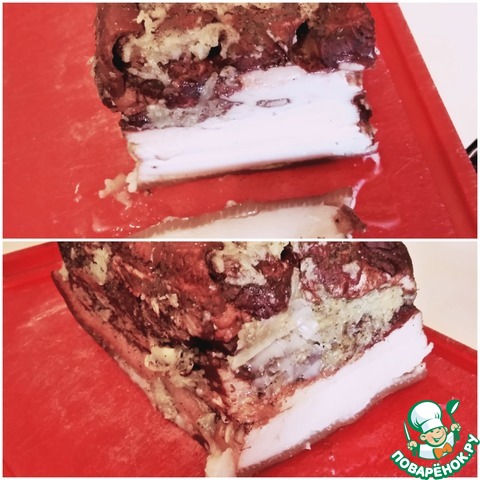После того как прошло 1 час 20 минут, достаю сало и быстро (пока оно еще горячее) натираю его чесноком (предварительно через чеснокодавку давлю около головки чеснока), натираю молотым черным перцем и выношу на холод остывать,