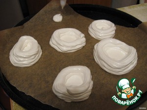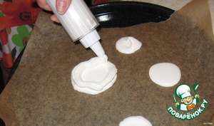 Выдавить кондитерским шприцом полученную массу вначале кружочком, придавить его немного, чтобы он был плоским.