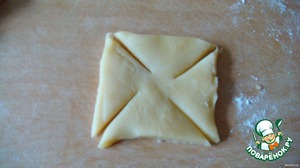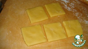 Раскатать тесто толщиной 2 см и формочкой вырежьте квадраты
