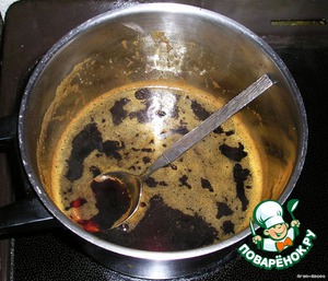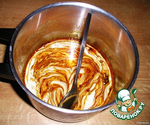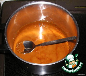 На медленном огне расплавьте сахар, постоянно помешивая ложкой, и "кипятите" его до тех пор, пока он не потемнеет и не приобретёт коричневый цвет.