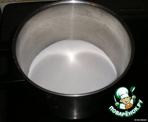 Всыпьте сахар в кастрюлю и поставьте на плиту, на малый огонь. -