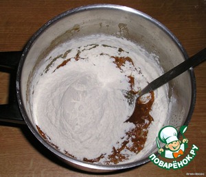 Всыпьте просеянную муку и пекарский порошок и хорошенько всё перемешайте ложкой в течение одной минуты.
