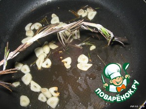 Добавить розмарин. Обжаривать до появления явно-выраженного запаха розмарина. Минуты 2.