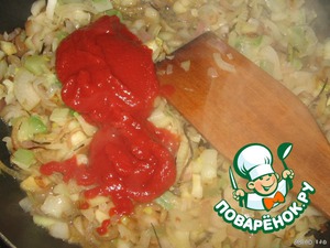 Когда выпарится вода, добавить томатную пасту, обжарить её секунд 20, а потом добавить немного бульона из кастрюли.