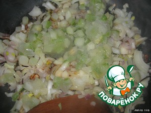 Затем добавить лук с томатом и кабачками. Варить 5 минут.