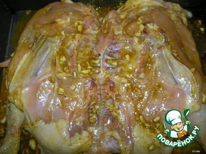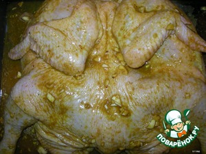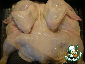Смажьте противень маслом и положите на него курицу спинкой вверх.