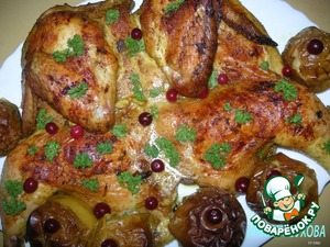 Выложите курицу на тарелку, посыпьте петрушкой, вокруг положите яблоки. Украсьте яблоки ягодками клюквы.