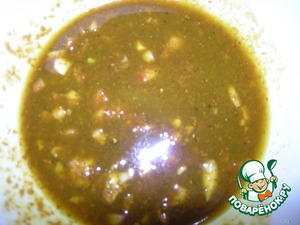 Смешайте пряности с соевым соусом. Нарежьте чеснок, добавьте к пряностям и размешайте.