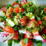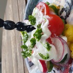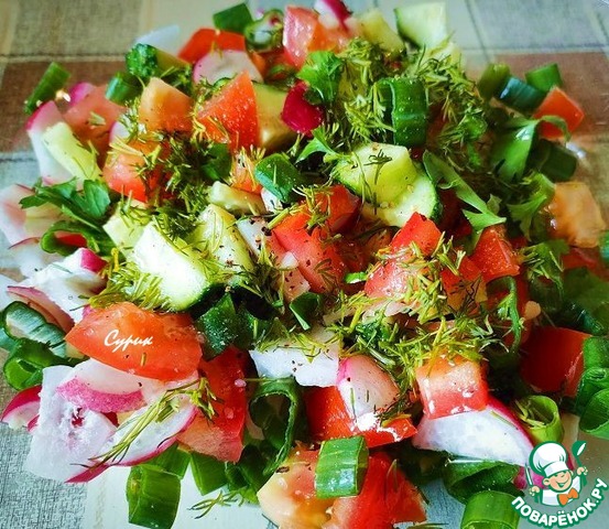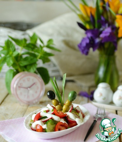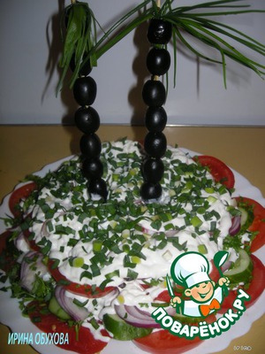 На блюдо уложить кружочки помидор, сверху - кружочки огурцов, следующий слой – лук, нарезанный полукольцами. Затем слой помидор, и слой редиски – порезанной кружочками. Каждый слой немного поливать майонезом, и посыпать мелко порезанной зеленью. Верхний слой посыпать измельченным зеленым чесноком. На 2 шпажки нанизать маслины, сверху воткнуть зеленый лук. «Пальмы» вставить в салат.