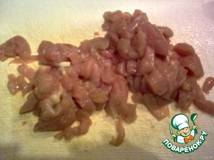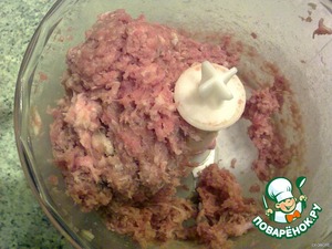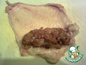 Два вида мяса перемешать. Количество мяса взято относительно. Просто у меня было всего 7 ровненьких шкурок, получилось 7 порций