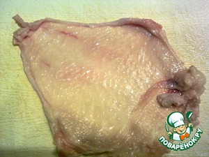 Куриную шкурку разложить на доске (у нас шкурки продаются в магазине на вес, можно аккуратно снять с куриной грудки).