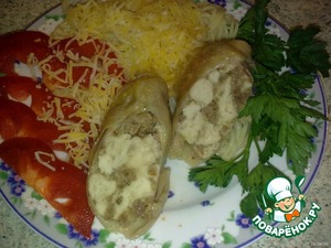 Свернуть рулетом, подворачивая края внутрь (как голубцы). Выложить на противень и поставить запекаться в духовку до готовности при 180-200* (это примерно 30 минут).