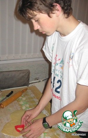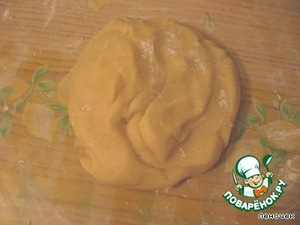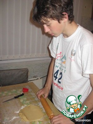 Раскатать тесто на столе присыпанном мукой в пласт толщиной 5-7 мм.