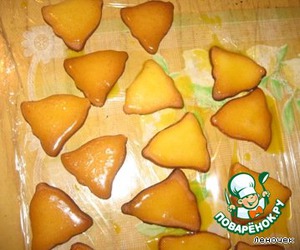 Глазурь: апельсин пропустить через соковыжималку. В полученный сок добавить сахар и довести на огне до кипения, постоянно помешивая. Когда закипит, смесь снять с огня, остудить немного, добавить масло и тщательно перемешать.