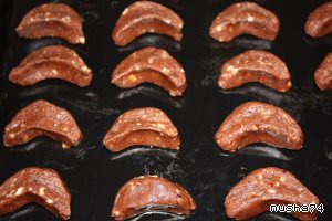 Остудить и смазать шоколадной глазурью(я смазала растопленным шоколадом)дать подсохнуть глазури и посыпать рогалики пудрой.