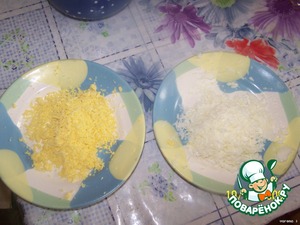 Яйца отвариваем, отделяем белки от желтков и натираем на мелкой терке.