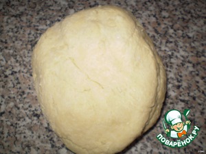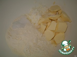 Теперь, пока начинка остывает, можно заняться тестом. Мягкий маргарин порезать на кусочки, добавить муку, творог, соль, сахар и замесить тесто. Количество муки зависит от влажности творога, но тесто не должно быть очень крутым.