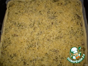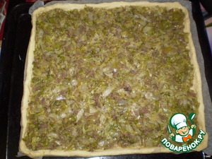 Просто раскатать или растянуть руками тесто по противню так, чтобы основа пирога была где-то 0,5 см толщиной, и поднять бортики у теста. Первым слоем пойдёт капуста. -