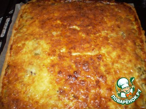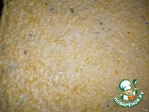 И всё это залить равномерно взбитой с яйцами сметаной.
