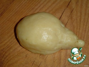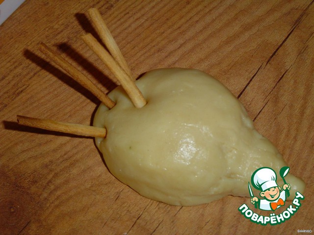 • После того,как достанем тесто из холодильника,отделяем небольшой кусочек и формируем тельце ежика,как показано на фото.