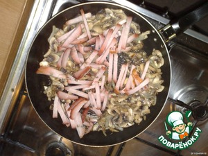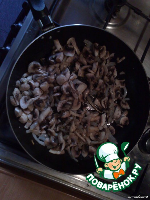 Когда лук будет золотистого цвета, добавляем шампиньоны, солим и перчим. -