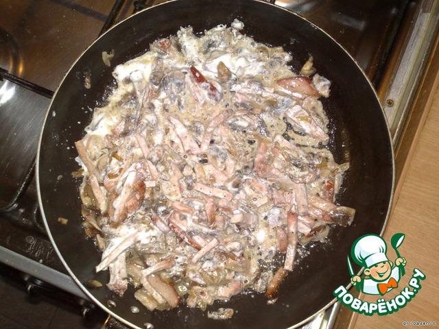 Ждём 5-10 минут, выключаем огонь и добавляем 200 г сметаны, перемешиваем постоянно и ждём, пока немного остынет…