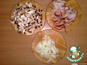 на отдельную досточку нарезаем мелко луковицу и шампиньоны. -