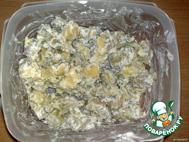 Смешиваем нарезанный картофель с укропом, чесноком и 200 гр сметаны.