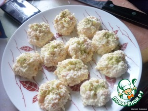 Готовый салатик при помощи двух чайных ложечек преобразовать в шарики, выложить шарики на тарелку (или блюдо - все зависит от масштаба).