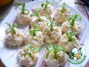 Теперь ответственный момент. Берем зеленый лук. На 1 шарик нужен кусочек пера лука примерно 3 см. С одного конца кусочка делаем подобие пальмочки, другим концом втыкаем в шарик.