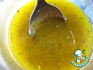перемешаем оливковое масло, сок, горчицу, соль, пряности; -