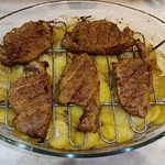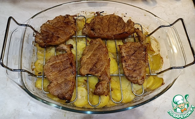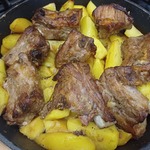 4. Картошку нарезаем и укладываем на противень, сверху ребрышки, и отправляем запекаться в разогретую духовку.