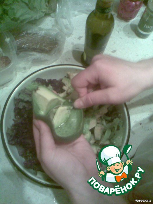 Авокадо измельчаем и добавляем к листьям салата, для чего разрезаем его на две половинки и маленькой ложечкой достаем кусочки нужного размера