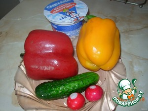 При подаче на тарелке нарисовать из соуса сетку, поместить в ячейки кружочки из огурца и редиса, полоски перца в виде "крестиков".