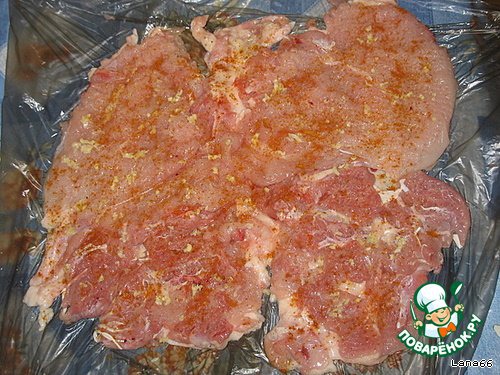 Прообраз руляды отбиваем слегка тяпкой для мяса, солим, перчим, добавляем чесночка...