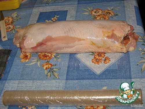 А мы такой рулет делали из окорочков :roll: Филе перекручивали на мясорубке с чесночком, добавляли черный молотый перчик, фарш раскладывали на снятой заранее шкурке - остальное всё также.Вкуууусноо! (Когда не было пищевой плёнки, варили в целофановых пакетах и перевязывали нитками) Давно хотела приготовить, спасибо, что напомнили