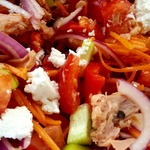 В холодильнике было всего по чуть чуть, оставшиеся грамм 300 остренькой морковки по-корейски не знала куда приспособить, а желающих доесть дома на оказалось, думала, думала и придумался такой вот салатик к ужину, к жареной картошечке))