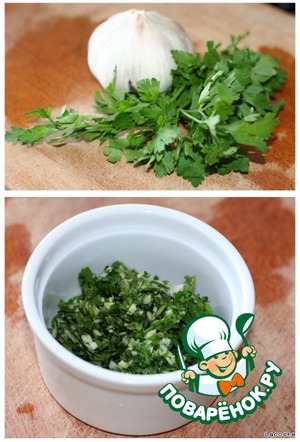 Измельчить зелень и чеснок в блендере.