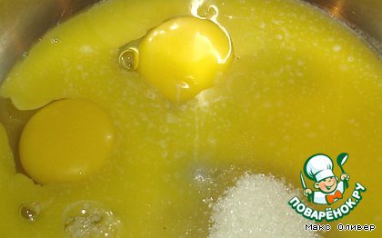 Помещаем в ёмкость миксера сахар, яйца и растопленное масло, тщательно перемешиваем.