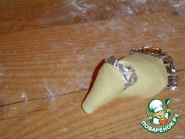 Сворачиваем фольгу конусом и оборачиваем ее надрезанным кружком. С помощью фольги приподнимаем тесто в месте надреза, тем самым формируя голову мышки.