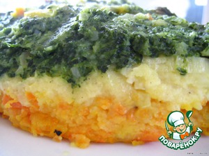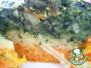 И выкладываем слой со шпинатом, затем слой с мускатным орехом, затем с морковью и запекаем в духовке около 30 мин. на "паровой ванне", (т. е. поставив блюдо с пюре в блюдо большего размера с водой) при 180°C.