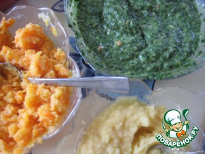в первую добавим шпинат, во вторую морковь, карри и куркуму, в третью мускат и перец;
