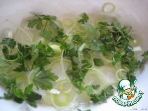 Огнеупорное блюдо смазываем маслом, посыпаем слегка мукой, выкладываем нарезанный кольцами лук-порей и петрушку