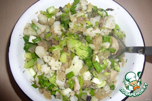 Смешиваем грибы с луком с брокколи,цветной капустой,зеленым луком.Солим,добавляем петрушку и базилик.