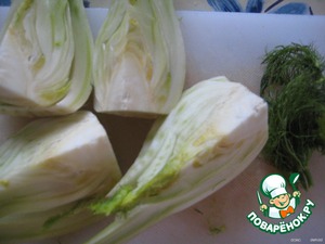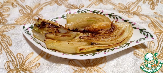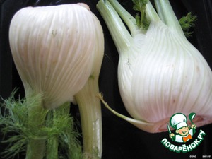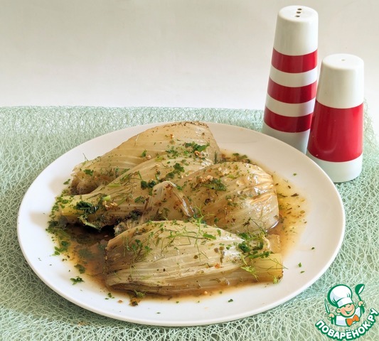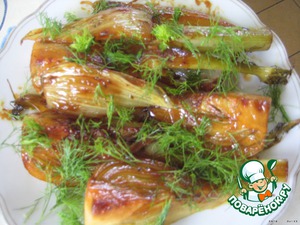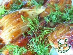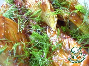 Готовые кусочки полить лимонным соком, посыпать измельченной зеленью фенхеля и подавать.