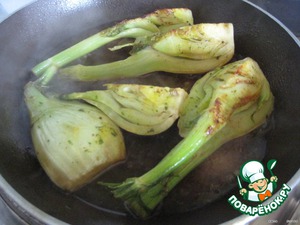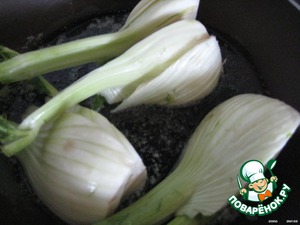 В разогретой сковороде растопить сливочное масло, добавить растительное и обжаривать фенхель со всех сторон, пока не подрумянится.