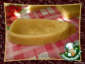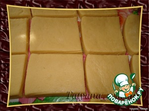 • Раскатать тесто в пласт толщиной 1 - 1,5 см. Нарезать его на небольшие прямоугольники.