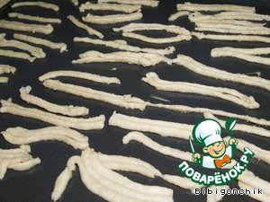 Затем вынимаем из холодильника и делаем палочки на мясорубке (перед этим из мясорубки выньте ножик). Кладем палочки на смазанный маслом противень.